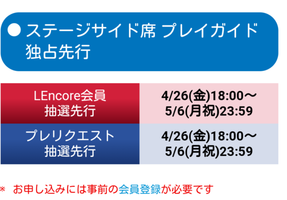 ※「ステージサイド体感席」は映像およびステージでのパフォーマンスが見えない可能性が高いお席となります。