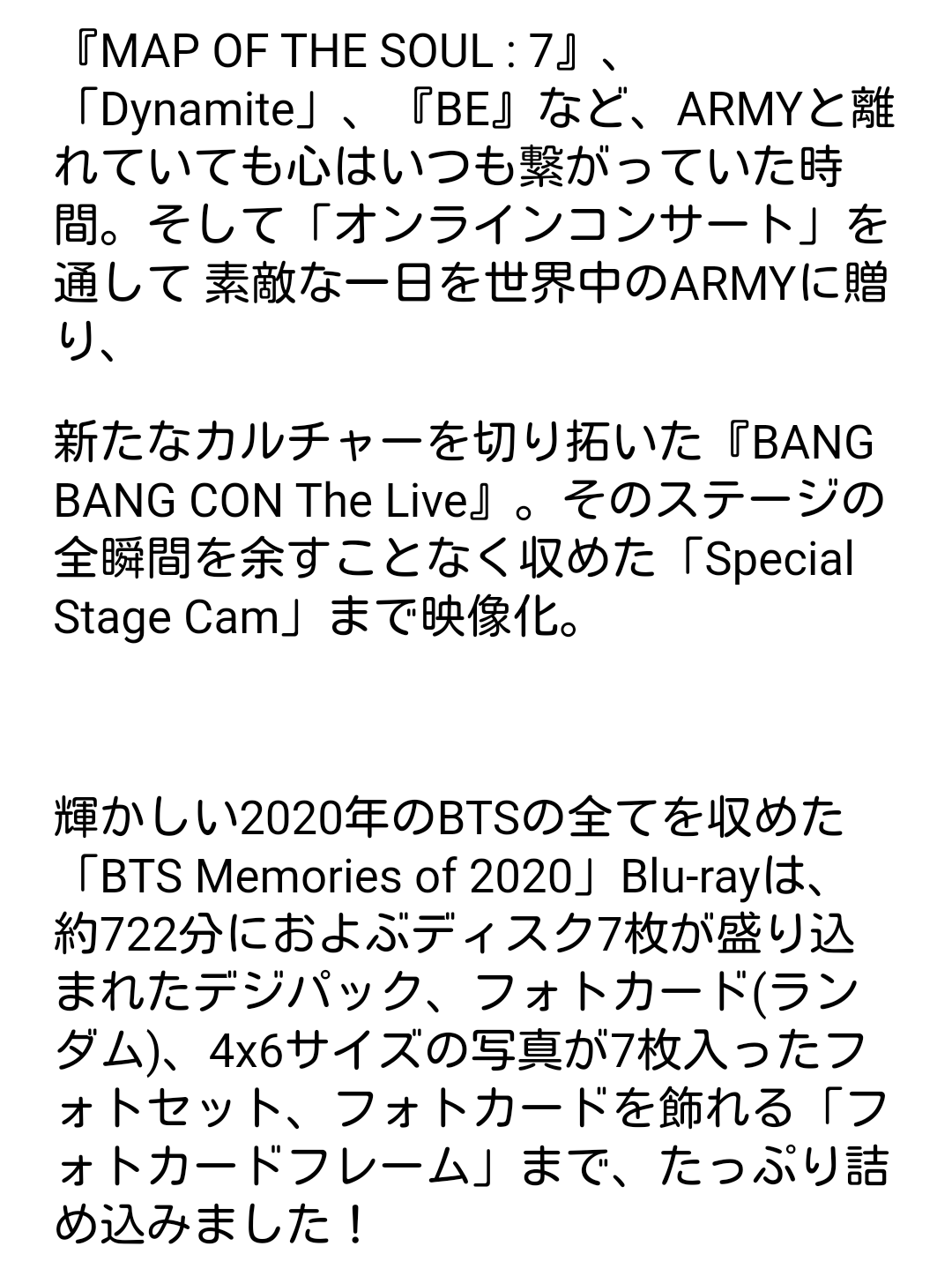 ‘BTS MEMORIES OF 2020’ DVD 内容・値段等