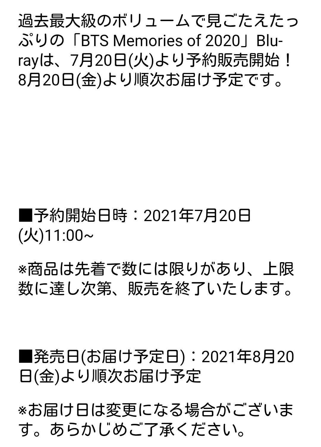BTS メモリーズ2020購入方法Twitter字幕DVDFC予約再販中8/7