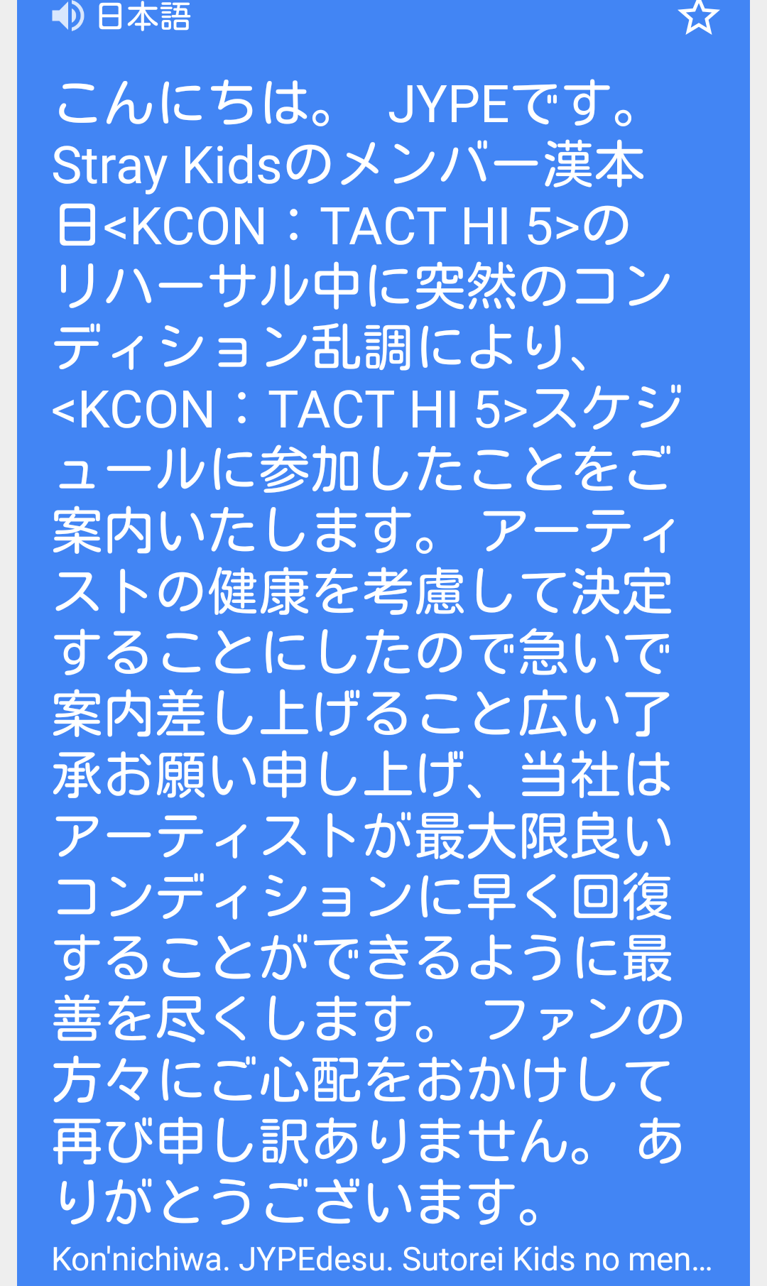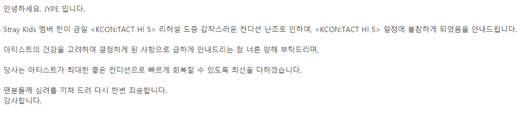 ハン·ジソン君体調不良KCON欠席へ