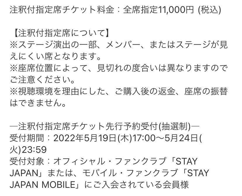 ステージサイド席【注釈付き指定席】ファンクラブモバイル会員