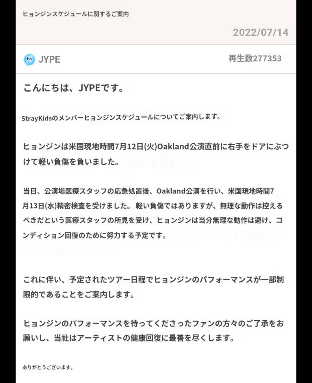 ☆ヒョンジン負傷について 公式Twitter