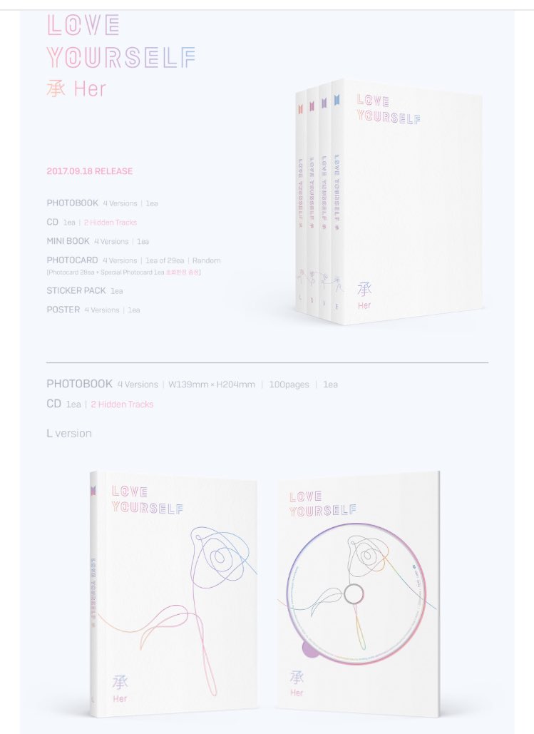 BTS防弾少年団ミニアルバム「LOVE YOURSELF-(承)Her」予約へ~値段、トレカ、等詳細(8/28、9/9追記